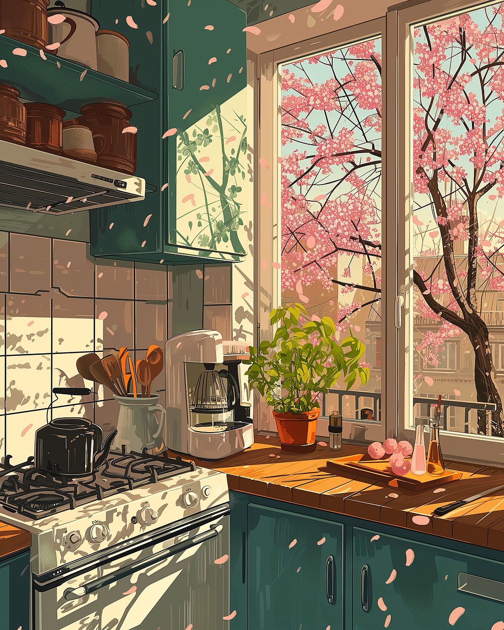 “지브리 스타일로, 서울 남산의 벚꽃이 만발한 봄 풍경을 표현해주세요.